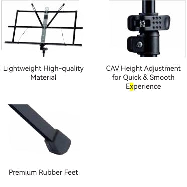 · Material: Steel, Plastic· Height: 865 - 1615 mm (Desk top to floor)· Height Adjustment: Quick Lock System· Base Diameter: 700 mm· Weight: 1.3 kg· Music Desk Dimensions: 510 x 285 x 23 mm